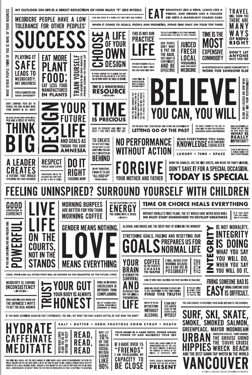 But what I took from Chip was that he starts with the books that he has found most important to his worldview. Then he asks his core team to "extract" the most significant and relevant few words from those books. With that as a basis, they then curate a set of words that form the basis of their values and culture. In fact, for many years, those words were printed on the Lulu Lemon bags. They referred to them as "the code". There are still words on Lulu bags but here is the full version. So much wisdom there (if you can read that on your phone...if not link below).