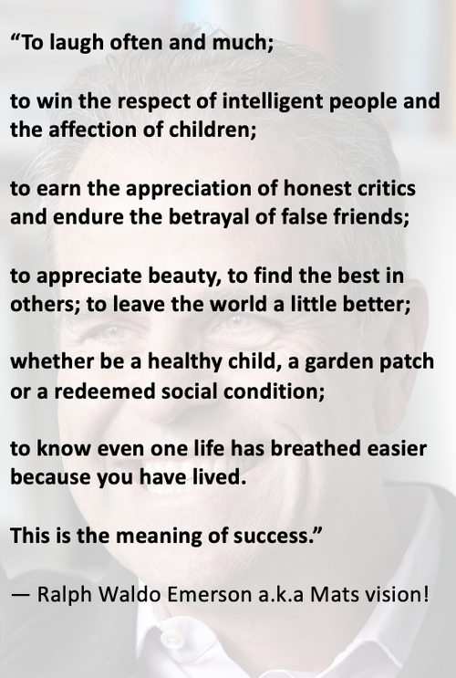 While I have a long way to go before I come even close to living up to this linguistic abstraction of "success" by Ralph Waldo Emerson it still, over 25 years later inspires me every day. And I hope it inspires you. To paraphrase another mentor, Benjamin Zander; "It might not be an expectation we can live up to but certainly it is a possibility we can live in to".